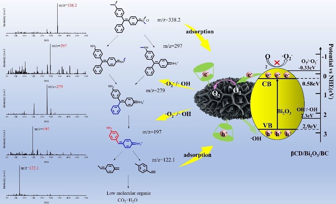 对染料污染物吸附及光催化降解方面,课题组以玉米秸秆生物炭为载体,通过共热解与表面修饰法成功构建了β-环糊精修饰的Bi2O3/生物炭复合材料,β-环糊精通过其疏水空腔增强对污染物的吸附与富集,同时调控界面电荷行为,抑制光生载流子复合,从而协同促进了污染物的表面富集与光催化转化。在可见光下,该材料对孔雀石绿展现出良好的降解效率和循环稳定性。相关研究成果以“β-Cyclodextrin modified Bi2O3/Biochar composite for highly efficient photocatalytic degradation of malachite green”为题,发表于《Applied Surface Science》(中科院SCI二区)。论文第一作者为黑料网 武占省课题组研究生刘泽源,通讯作者为武占省教授、杨博龙副教授,黑料网 为唯一通讯单位。