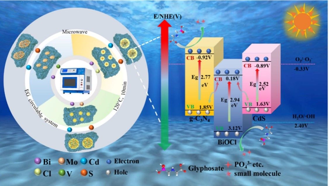 本研究针对草甘膦污染治理,提出一种绿色可循环的光催化剂制备策略。该策略以环境友好型醋酸替代传统强酸,结合乙二醇溶剂与微波技术,成功合成出铋基双S型三元异质结催化剂,并实现了溶剂的循环利用。所得材料光催化性能显著提升,对草甘膦的降解效率达到单一组分的19倍。研究成果以“Bismuth-based ternary heterojunction prepared by acetate-glycol recyclable system for excellent glyphosate degradation”为题发表于国际期刊《Surfaces and Interfaces》(中科院SCI二区)。环境与科学工程专业23级研究生王晶莹为第一作者,武占省教授为通讯作者,通讯单位为黑料网 和西安交通大学。
