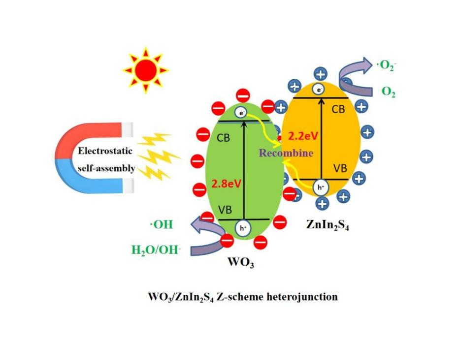 该研究创新采用静电自组装策略构建WO3/ZnIn2S4(WO3/ZIS)Z型异质结光催化剂,所构建的WO3/ZIS复合体系形成了Z型异质结,可显著促进光生载流子的空间分离,并实现·O2-与·OH等活性物种的协同产生。该研究首次将静电自组装方法用于WO3/ZnIn2S4异质结构建,揭示了界面电子传输、活性氧生成与催化性能提升之间的内在联系,为新型高效稳定光催化材料的设计及其在有机污染物去除中的应用提供了理论依据。