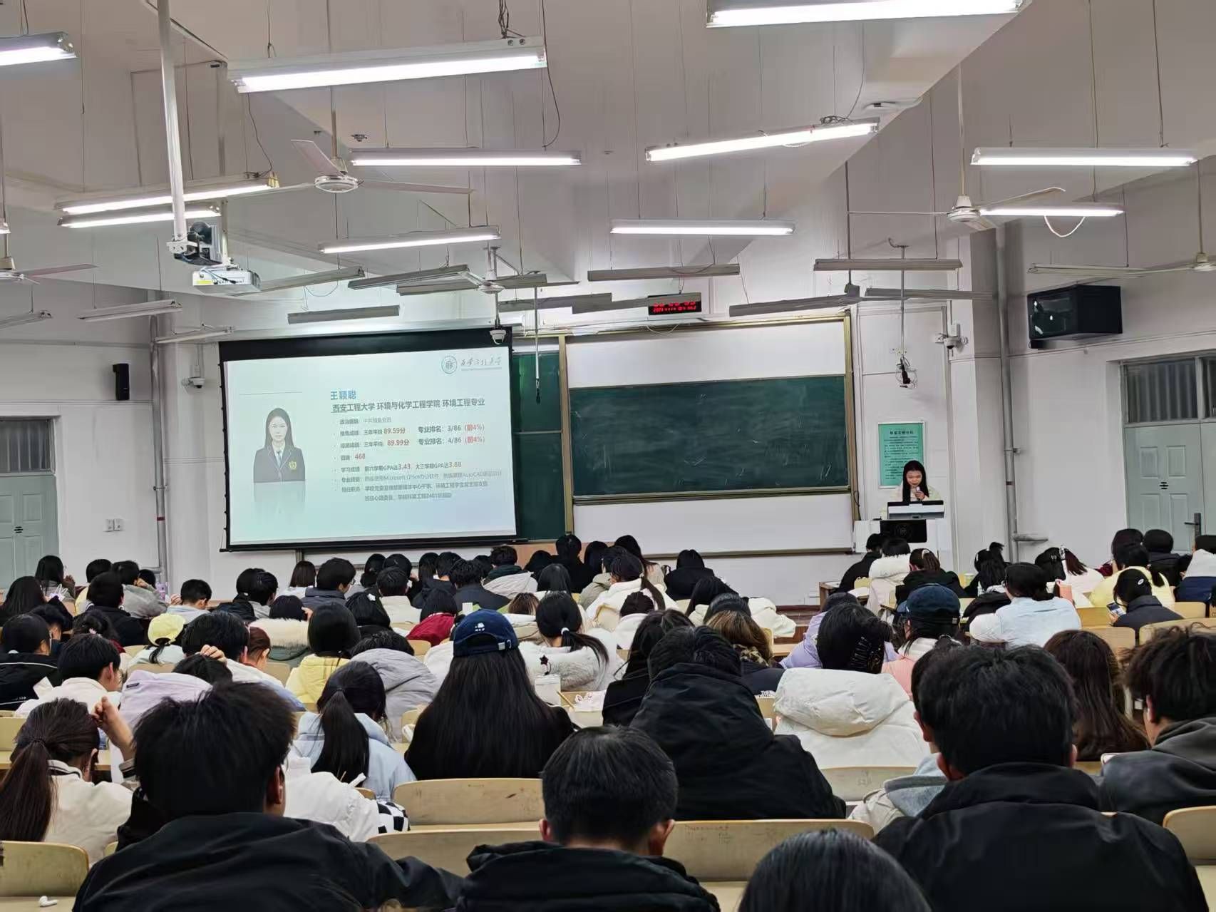 各类奖助政策的支持,因此更加珍惜机会,奋发前行。应用化学专业索欣歌针对低年级同学的困惑,提出分阶段规划建议:大一首重基础课程与绩点积累,大二积极参与科研竞赛,大三精准投递与备战面试。她还分享了在国家奖学金、助学金等资助政策的帮助下,顺利完成学业并成功保研的励志经历。化学工程与工艺专业薛宇昊则围绕面试环节,细致讲解了专业问题应答与科研经历陈述的相关技巧与注意事项。