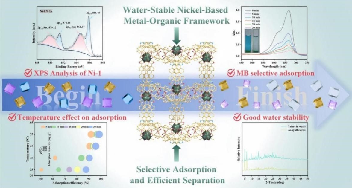 论文二:本研究利用吡啶四羧酸配体构建了一种新型阴离子镍基MOF(Ni-1)。该材料结构稳定,在水中可保持完整框架。研究表明,Ni-1通过静电吸引、氢键、π-π作用及金属位点配位协同机制,实现对阳离子染料亚甲基蓝的高效选择性吸附,而对阴离子染料无吸附作用(图2)。同时,材料具有良好的可再生性和实际水环境抗干扰能力,为染料吸附分离提供了可行的设计思路。