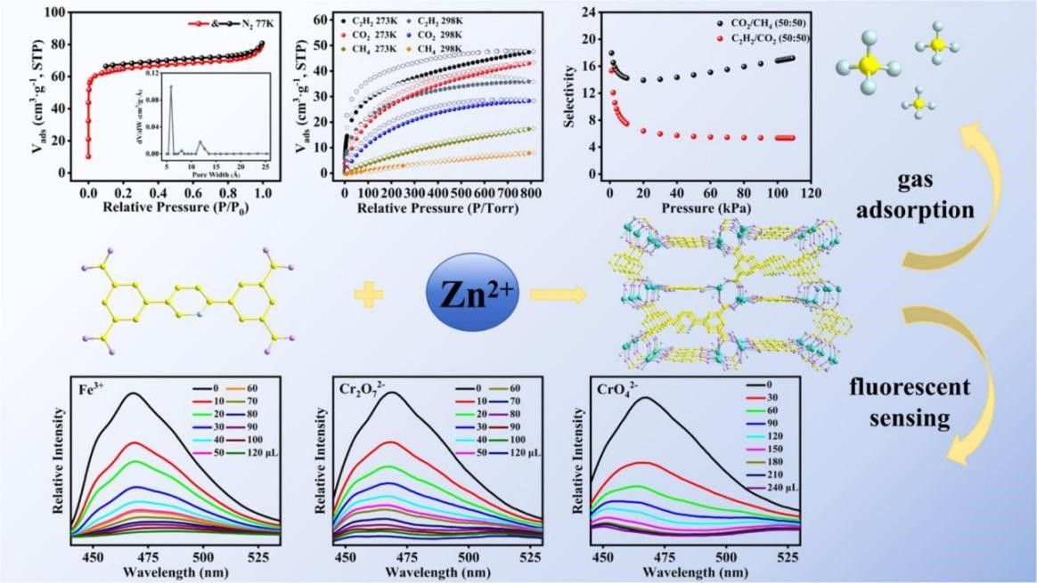 论文三:本研究通过水热法,以吡啶羧酸为主配体、氨基四唑为辅助配体,与锌离子成功构建了一种新型三维锌基金属有机框架材料(Zn-MOF)。该材料兼具气体吸附分离与荧光传感双重功能。其丰富的孔道结构和裸露氮位点赋予其对乙炔和二氧化碳的良好吸附能力,并对CO2/CH4及C2H2/CO2混合气体具有优异的分离选择性(图3)。同时,Zn-MOF可作为荧光传感器,在水溶液中选择性识别Fe3+、Cr2O72-和CrO42-离子。该工作为开发多功能MOF材料提供了有效设计思路。