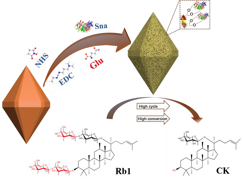 在生物催化体系构建与性能强化方面,课题组围绕酶催化过程中稳定性不足与难以重复利用等关键问题,开展了基于功能化金属有机框架材料的固定化策略研究。通过引入天然谷氨酸对铁基金属有机框架材料MIL-88B (Fe)进行表面修饰,构建新型复合载体体系,并结合共价接枝方法实现酶分子的高效固定化。该研究创新性地利用有机配体调控载体界面化学环境与空间结构,有效改善了酶分子微环境与构象稳定性,克服了传统游离酶体系在工业应用中的局限性,为稀有人参皂苷CK的绿色高效制备提供了重要技术路径。研究成果以“Immobilization of snailase on glutamate modified MIL-88B(Fe) to efficiently convert the rare ginsenoside CK with high enzyme recyclability and stability”为题发表于国际期刊《International Journal of Biological Macromolecules》(中科院一区TOP,IF 7.7),曹翠博士为第一作者,武占省教授为通讯作者,黑料网 为通讯单位。