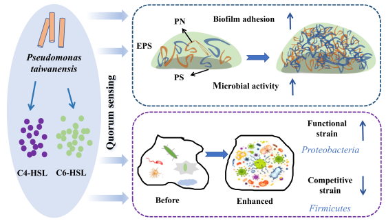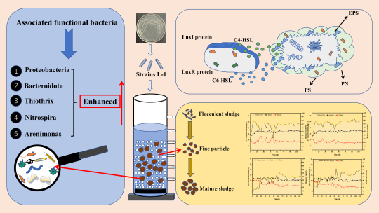 论文一:本研究通过筛选出分泌内源信号分子(AHLs)的菌株L-1并构建强化污泥颗粒化系统。结果表明,实验组污泥颗粒化进程较对照组缩短15天,污染物去除效率显著高于对照组。L-1菌株可促进微生物分泌胞外聚合物,优化污泥结构稳定性,还使系统优势菌属发生转变(图1)。该研究为AGS技术的快速启动、稳定运行及工程应用提供了高效环保的解决方案与理论技术支持。