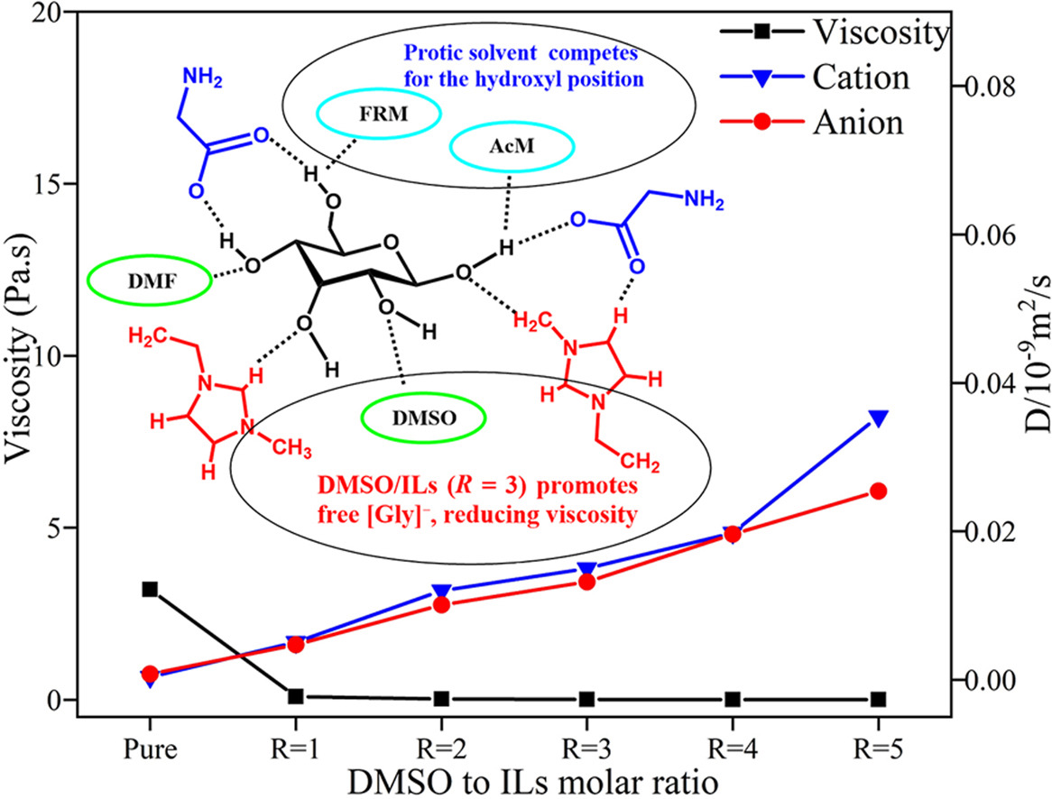 纤维素是自然界中储量最丰富的可再生高分子资源之一,在生物燃料、生物基材料和精细化学品制备等领域具有重要应用前景。然而,纤维素分子间和分子内致密稳定的氢键网络使其难溶于常规溶剂,严重制约了其高值化利用。氨基酸离子液体因具有低毒性、良好生物相容性和可降解性,被认为是极具潜力的绿色纤维素溶剂,但其较高黏度以及助溶剂协同作用机理尚不清晰,仍是制约其实际应用的关键瓶颈。