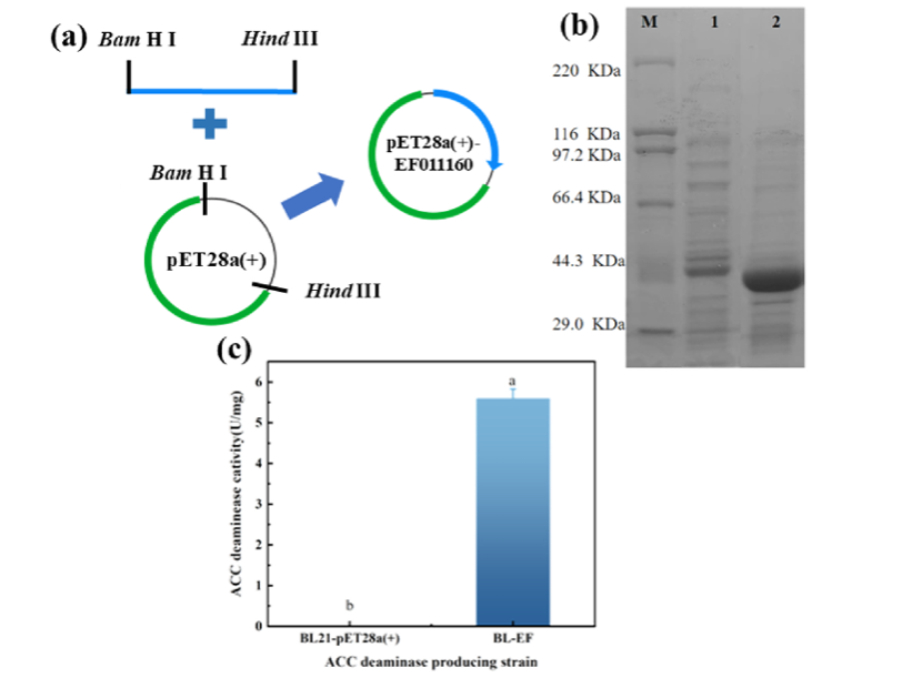 近年来,土壤盐渍化已成为制约农业生产的主要环境因素之一,严重影响作物生长和产量。传统的物理、化学改良方法虽有一定效果,但存在成本高、不可持续等问题。植物根际促生菌(PGPR)因其环保、高效的特性,逐渐成为盐碱地改良的研究热点。其中,能够产生ACC脱氨酶(ACCD)的微生物,可通过降低植物体内乙烯水平,增强植物对盐胁迫的耐受性,展现出广阔的应用前景。然而,天然菌株中ACC脱氨酶产量较低,限制了其在实际应用中的效果。
